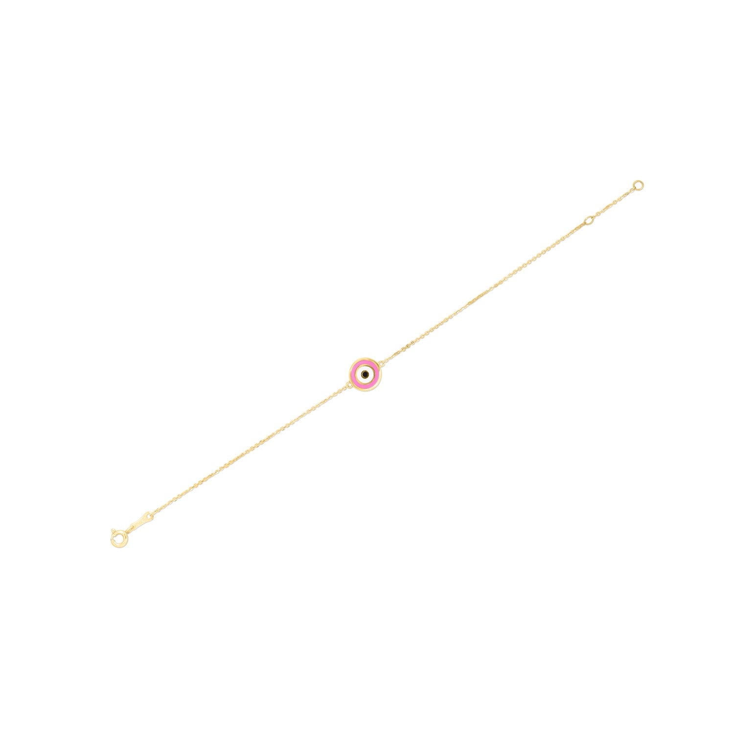 This beautiful 14k yellow gold Pink Evil Eye bracelet comes in a high polish finish & closes with a spring clasp. This piece is hand crafted & sits effortlessly between a glimmering rolo chain. With a touch of protection & a touch of style this piece is sure to stand out. Measuring 7 inches in length.